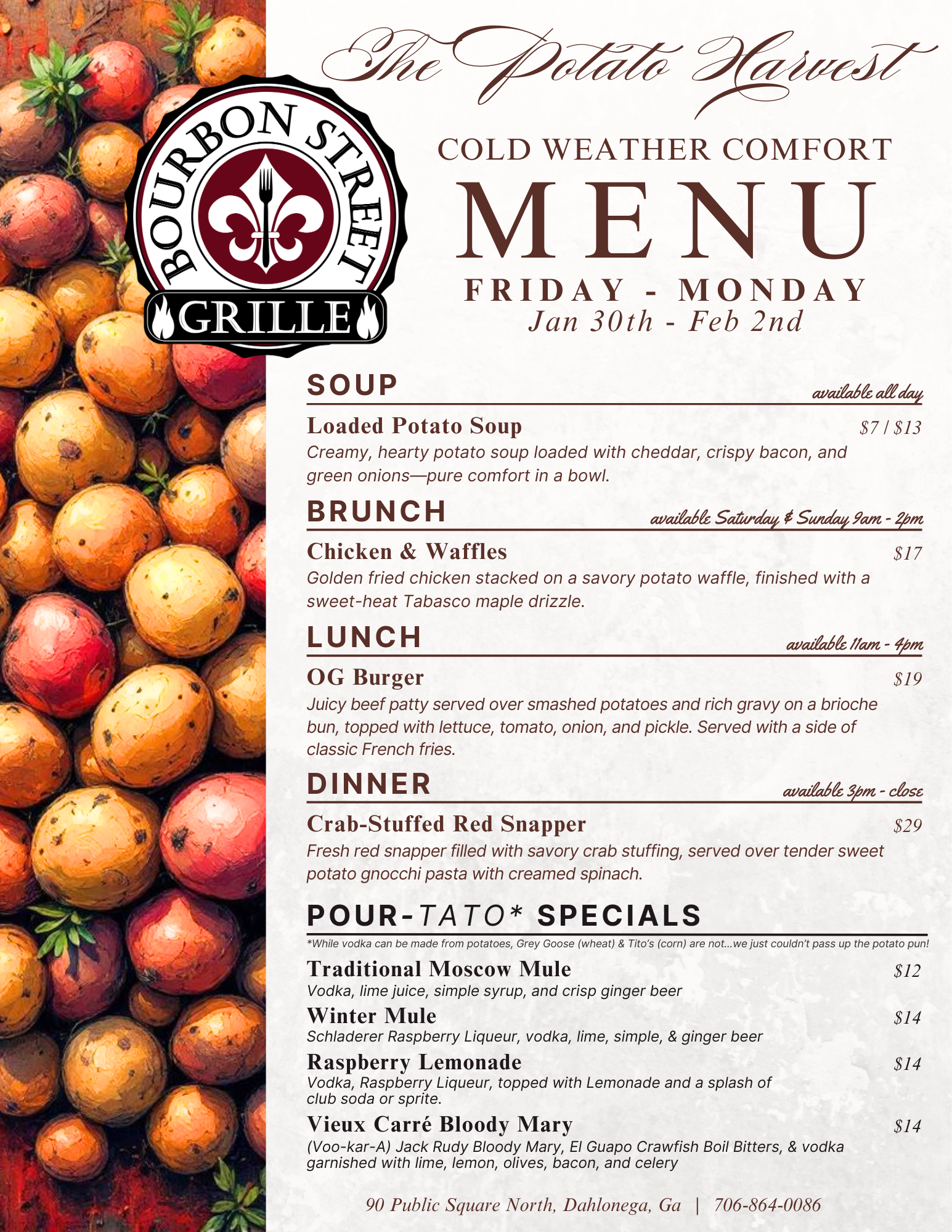 It’s going to be a spud-tacular weekend at Bourbon Street Grille! We’re rooting for comfort food this weekend
