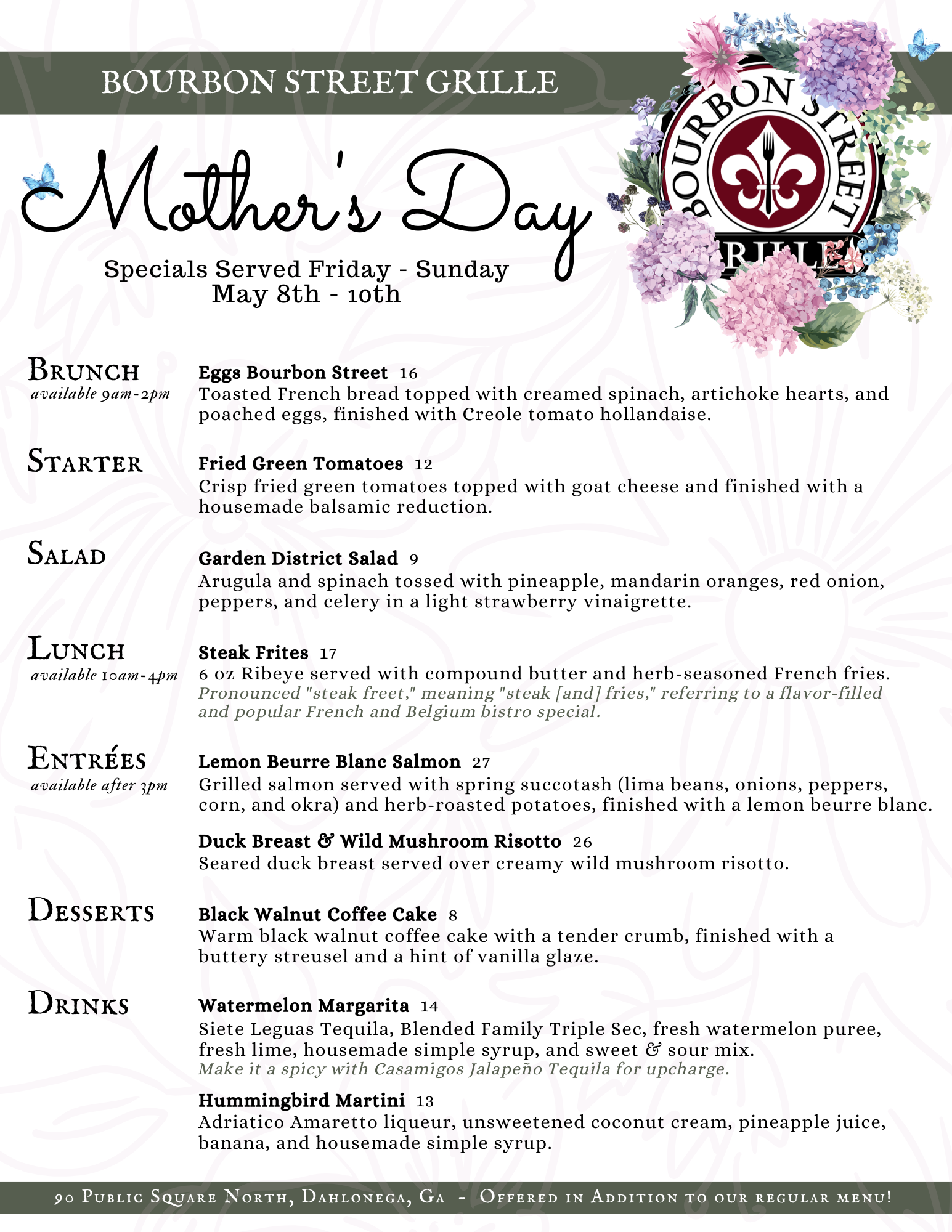 Join us for a spring-inspired celebration—fresh flavors, Southern touches, and a little Cajun soul.